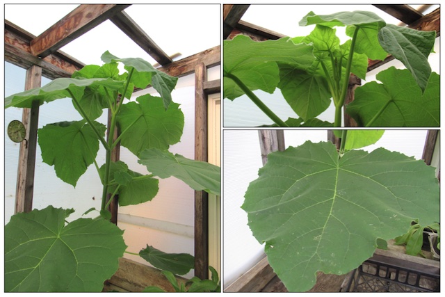 Sharon writes, "I'm hoping some of the local plant folks can identify this monster which has taken over a corner of my greenhouse. Its about to hit the roof, so will need to be removed, but I like knowing the names of things. The leaves are thin and velvety. The single leaf in the photo measures 15 inches from tip to the indentation at the top. Willis-the-Cat enjoyed its shade--until it crowded him out."