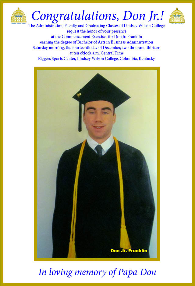 CU's December commencements to feature 196 graduates The Rev. Joel Carwile, pastor of Valley View Church in Louisville, will receive an honorary doctorate of divinity in the 2pmCT ceremony, and the Rev. John Chowning, vice president for church and external relations and executive assistant to the president, who also pastors Saloma Baptist Church, will receive an honorary doctorate of public service degree at the 4pmCT ceremony By Lucas Pennington CAMPBELLSVILLE, KY - Campbellsville University will hold two commencement exercises Friday, December 13, 2013, at 1pmCT/2pmET and 3pmCT/4pmET, in Ransdell Chapel, 401 N Hoskins Avenue, Campbellsville, KY, when 196 graduates will receive diplomas. The 1pmCT/2pmET commencement ceremony will be for the bachelor of science and bachelor of science in business administration graduate candidates, and the 3pmCT/4pmET ceremony will be for all associate, bachelor of arts, bachelor of music, bachelor of science in nursing, bachelor of social work and all master degree candidates. Article continues... click title or click here to read whole article. 2013-12-13 11:31:13 | Comments | Printable version