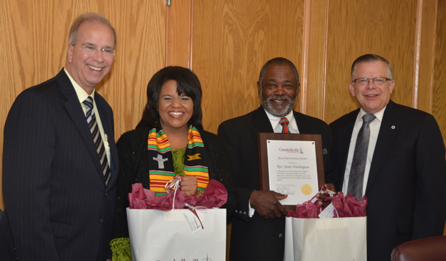 Rev. James Washington receives CU Racial Reconciliation Award Rev. Washington is pastor of New Zion Baptist Church, near Fairplay in Adair County, KY By Jose Soriano Click on headline for story with photo(s) News from Campbellsville University CAMPBELLSVILLE, KY - The Rev. James T. Washington, a member of Greater Campbellsville United, a staff person with the Healing Place and pastor of New Zion Baptist Church in Adair County, was Campbellsville University's 2013 Racial Reconciliation Award recipient. Article continues... click title or click here to read whole article. 2013-12-20 16:40:47 | Comments | Printable version