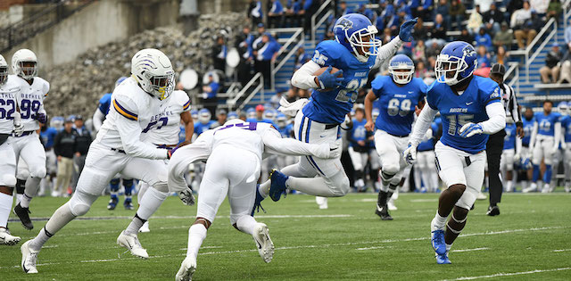 No. 10 LWC Football falls to No. 5 Bethel 56-30 By Christopher Coombs The No. 10 Lindsey Wilson football team fell to No. 5 Bethel (Tenn.) 56-30 on Saturday afternoon at Blue Raider Stadium in Mid-South Conference Bluegrass division action. The Blue Raiders (5-3, 2-2 MSC) were outgained by Bethel (9-0, 5-0 MSC) 606 yards to LWC's 425 yards as the Wildcats ground game managed to produce 426 yards of their offense. Lindsey Wilson's Trent Mueller recorded eight tackles in the game for the Blue Raider defense as he is now the programs all-time tackles leader with 304 tackles in his career. Mueller passes Michael Brooks who donned the LWC uniform from 2012-15 and recorded 303 career tackles. Article continues... click title or click here to read whole article. 2018-10-27 19:14:34 | Comments | Printable version | See topic Sports
